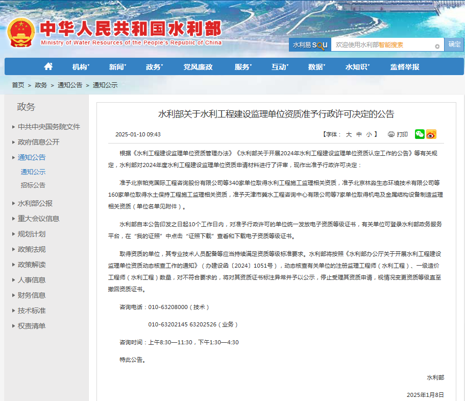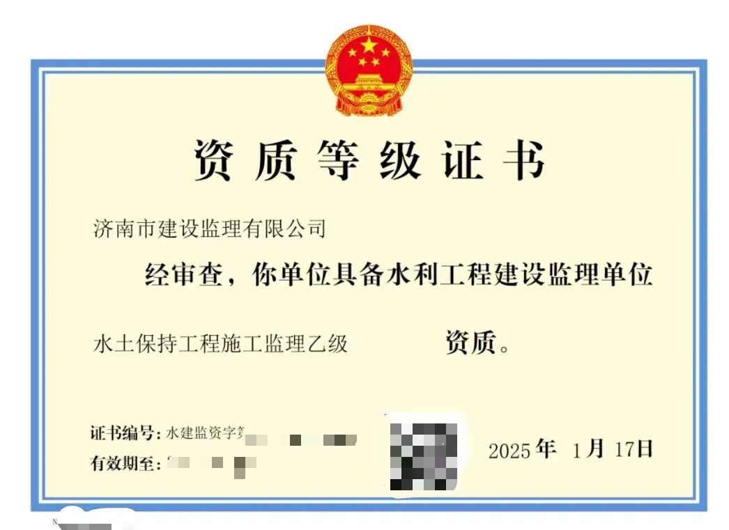 二〇二五年一月,經(jīng)水利部批準,我公司同時取得水利工程施工監(jiān)理乙級資質(zhì)及水土保持工程施工監(jiān)理乙級資質(zhì)。這是我公司在取得工程監(jiān)理綜合資質(zhì)后,又獲得的住建部管理范疇之外的從業(yè)資格,為公司經(jīng)營業(yè)務開辟新的領域,為公司業(yè)務類型的拓展提供新的平臺,也為公司持續(xù)、快速發(fā)展奠定了堅實基礎。